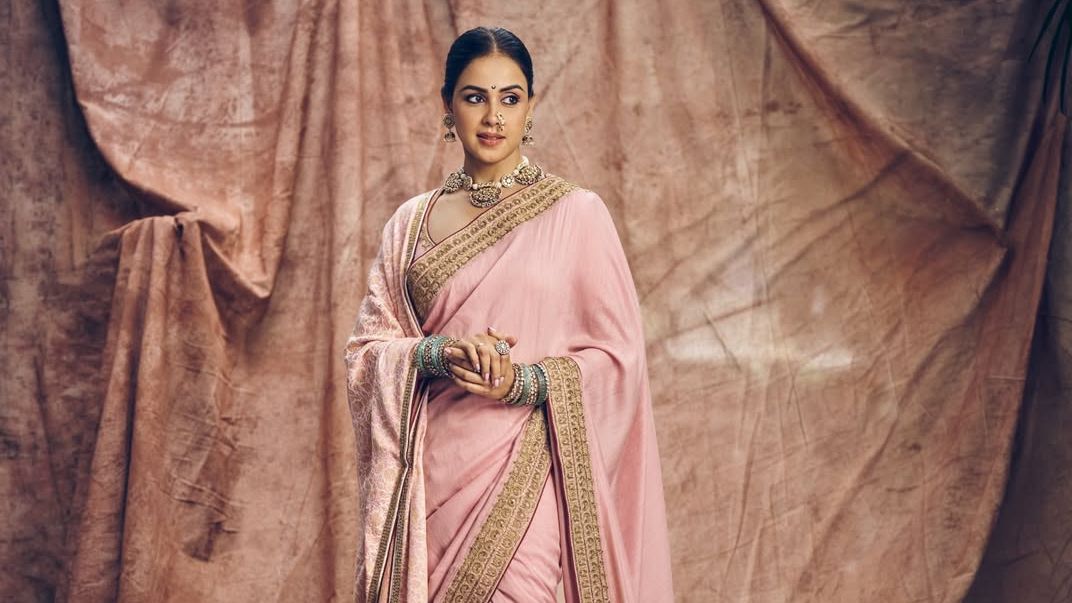 Cut from a raw tissue silk, the kurta and trousers carried a tactile heaviness, giving the silhouette weight and form. The sleeveless kurta was left unadorned, letting the fabric’s natural slub and matte sheen stand out, while the wide trousers featured intricate borders embroidered with traditional mukaish and gota work in muted tones of rose gold, sage and deep maroon. Over it, she wore a brown georgette dupatta, which made the palette feel both archival and fresh. It was embellished with sequin embroidery in a scattered, almost constellation-like pattern and featured hand-embroidered mirror-like floral appliqués that added glints of reflection along the border.