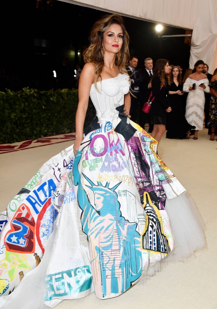 For her debut appearance in 2018, the philanthropist wore a statement strapless white gown with vibrant graffiti-inspired artwork by Prabal Gurung. Straying slightly from the theme, ‘Heavenly Bodies: Fashion and the Catholic Imagination’, the dress featured an assortment of eclectica — bold lettering, patchwork, and a large figure of the Statue of Liberty — merging street art with high fashion. Minimal accessories kept the focus firmly trained on the sumptuous dress.