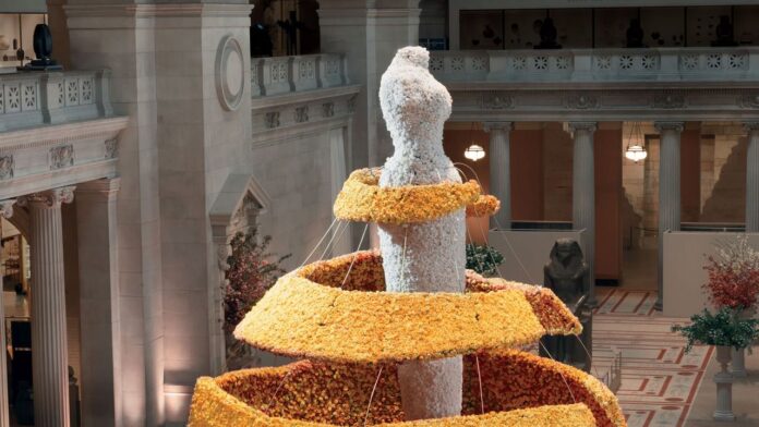 In 2024, Ávila and the Vogue special events team turn the Temple of Dendur into an enchanted forest. Last year’s event—“Superfine: Tailoring Black Style”—took inspiration from famed artist Cy Gavin’s narcissus flower motif, which was a nod to “self-recognition,” and sparked a floating tower of narcissus flowers as the Great Hall centrepiece.