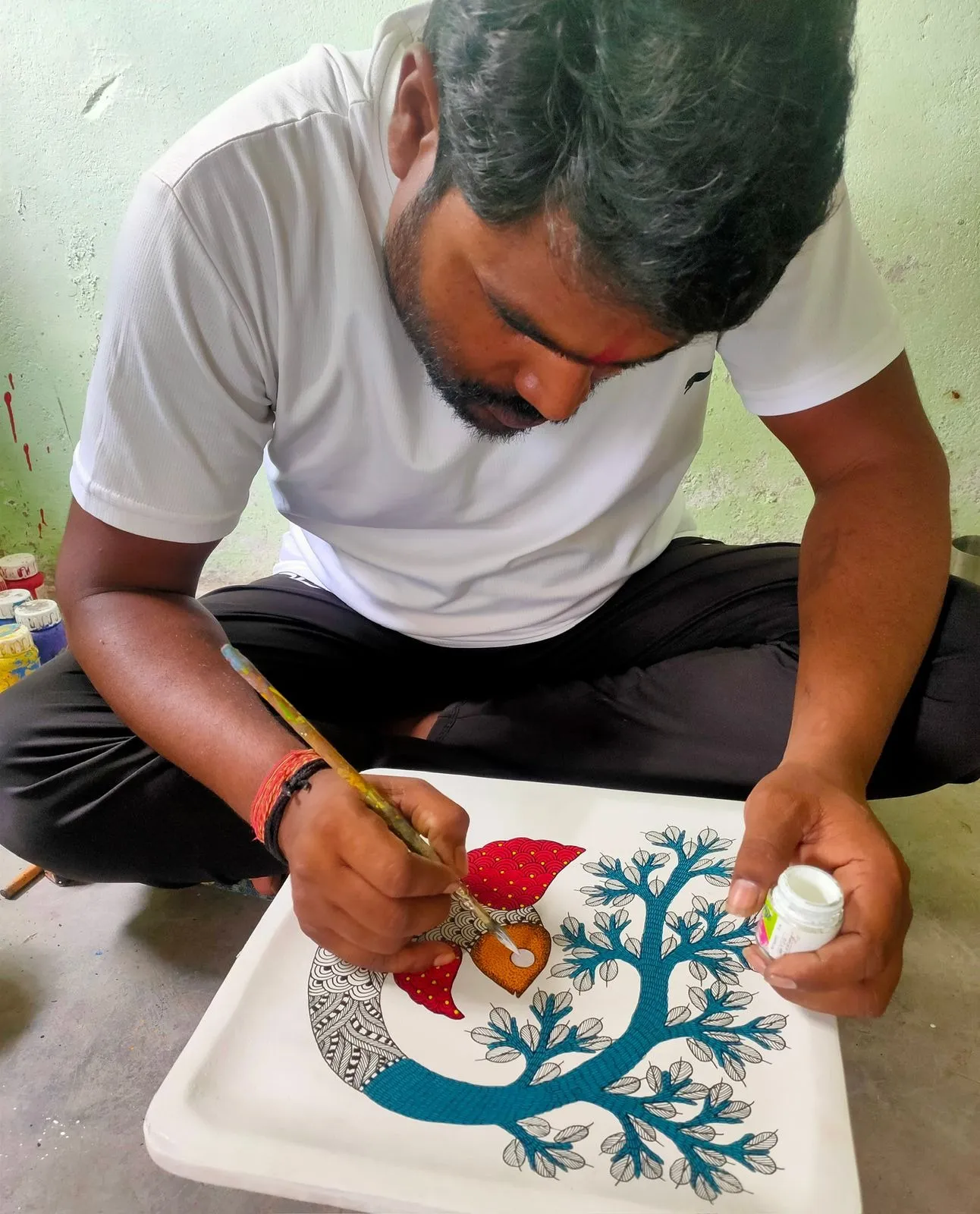 Santu Tekam lives in Patangarh, a small town in Madhya Pradesh where Gond tribal painting is as ordinary as farming. In his village of about 1,000 people, nearly 100 practise the art. Some are still learning. His wife helps him with the painting. His parents tend to their fields.