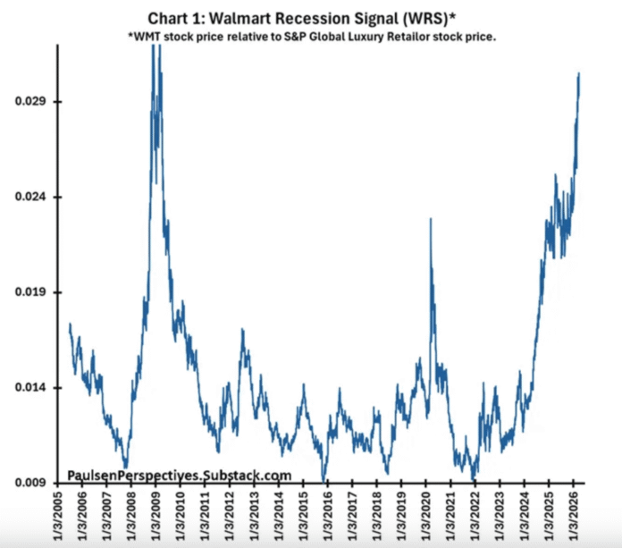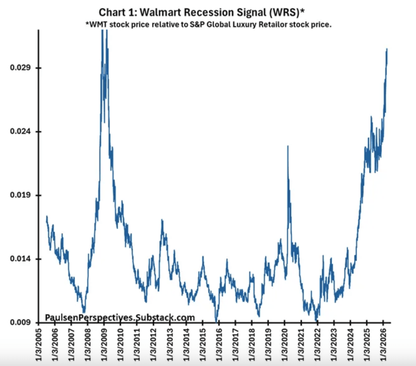 Paulsen, the former chief investment strategist at investment research firm Leuthold Group, devised an indicator he dubs the “Walmart Recession Signal” (WRS), which tracks the stock price of Walmart against the S&P Global Luxury Index, a basket of 80 companies producing or distributing luxury goods. He said that since economic downturns are usually felt first by lower-income individuals, an increase in Walmart stock price could indicate a potential economic downturn.