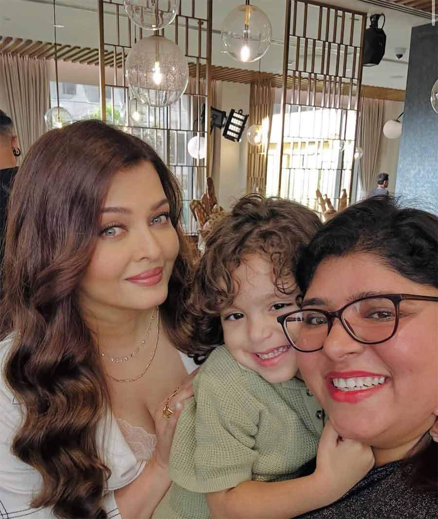 In the pictures circulating online, Aishwarya is seen posing for a cheerful selfie with a curly haired child actor. Dressed in elegant shades of white with her hair styled in soft, loose waves, she looked radiant as ever. The young co star, wearing a pastel green outfit, appeared a little shy but smiled brightly while leaning in for the candid click.