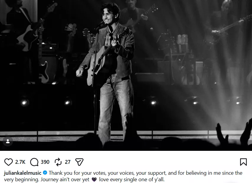 The results for American Idol Season 24’s Top 11 were delayed last week due to technical issues. However, as the show returned on April 6, 2026 (ET), the makers announced the two eliminations, abruptly ending Julian Kalel and Jake Thistle’s journey. However, while the former’s fans were not happy about the singer’s exit, Julian has claimed that he is not anywhere near done and the fans will see more of him very soon. Following the elimination announcement, Julian Kalel took to his social media accounts and shared a monochrome photo of himself on the stage of American Idol Season 24. He penned a heartfelt caption along with the picture that read: