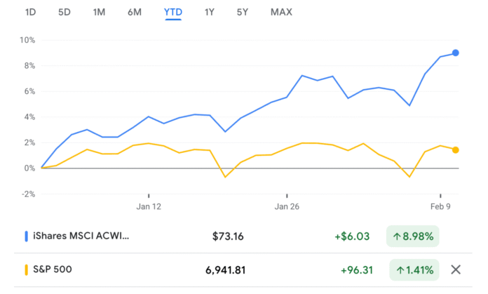 Global stocks are up nearly 9% year to date, as tracked by the MSCI ACWI ex U.S. ETF, an exchange-traded fund that tracks mid- and large-cap stocks in all countries except the U.S.