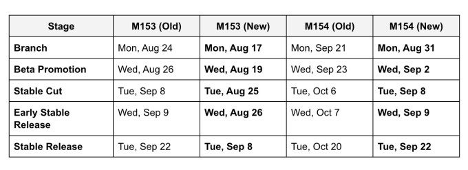 The new release schedule starts with the beta and stable versions (ver. 153) of Chrome on September 8, 2026, and will apply to all platforms, including desktop, Android, and iOS. No changes are being made to other early release platforms, like the Dev and Canary channels.