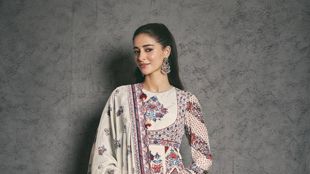 Ananya Panday stepped out in a Torani anarkali set that plays with print placement as much as silhouette. In classic anarkali style, the bodice sits close through the upper torso before releasing into a full skirt. What keeps it from feeling too familiar is the way the digital chintz is handled. Instead of a uniform all-over print, the pattern shifts. The empire panel carries the boldest motifs, while the skirt and sleeves break them up into smaller repeats.