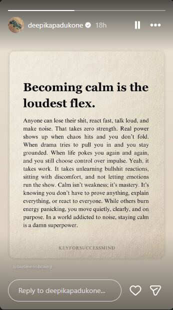 The post also stated that calm is weakness, it is mastery. “It’s knowing you don’t have to prove anything, explain everything, or react to everyone. While others burn energy panicking, you move quietly, clearly, and on purpose. In a world addicted to noise, staying calm is a damn superpower,” the quote concluded.