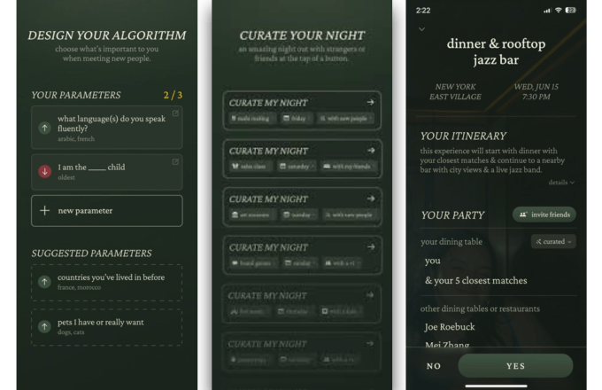 The app 222 is an iOS-only social events platform that facilitates in-person meetups by pairing a group of strangers based on their personality test results. The app sends invitations to nearby public social events, such as wine bars and comedy clubs. There is then a vetting process, and selected participants are notified on the day of the event. A bonus for those who feel socially anxious: You’re allowed to bring a plus-one.