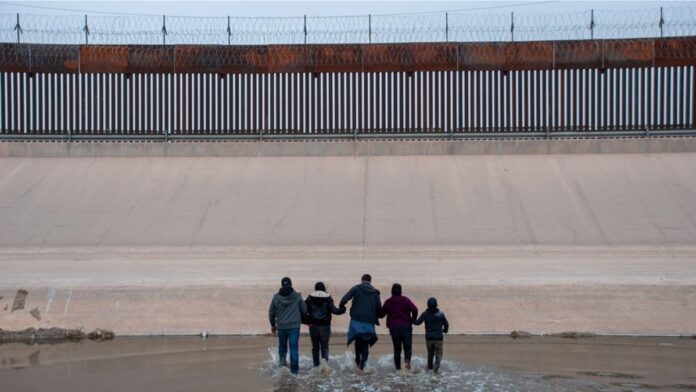 A family seen walking towards a barrier blocking passage across the U.S. border. (Department of Health and Human Services)