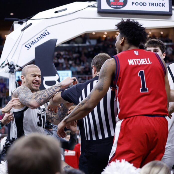 Providence forward Duncan Powell took down Hopkins in transition with a clothesline, starting a fight that led to six ejections.