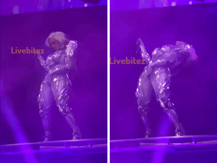 Watch the video … while a guitar solo blasts in the background, Cardi goes to town on herself in front of the screaming sold-out crowd.