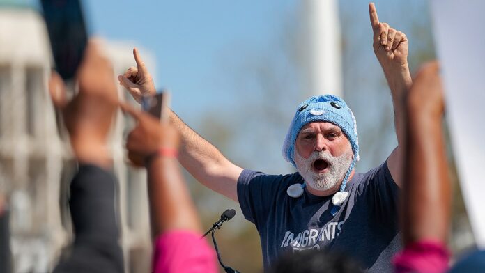 Well-known D.C. chef and activist José Andrés leads protesters outside the Supreme Court on Wednesday, April 1, 2026. (Photo by Heather Diehl/Getty Images)