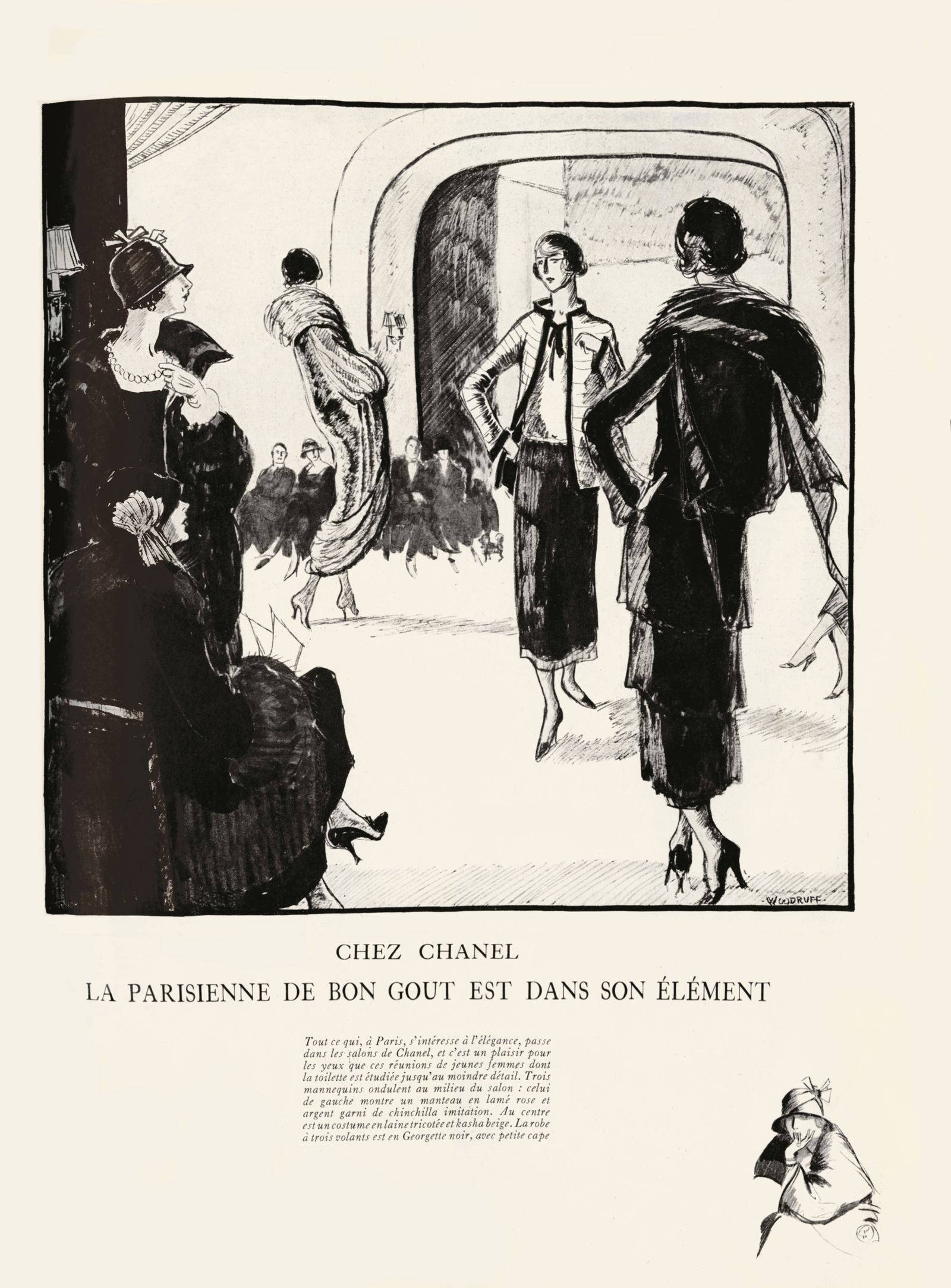 “CHEZ CHANEL ‘Short and straight’ is the unvarying motto of Chanel; therefore the mannequin (left) wears a youthful pink lamé wrap trimmed with chinchilla. The kasha suit has a paletot of wool tricot; the costume of black georgette (right) a tiered skirt and cape-backed jacket.”