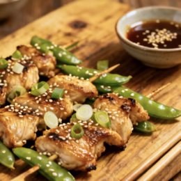 These Chicken and Snow Pea Skewers are a fresh, flavorful way to bring healthy grilled food to your dinner table. Tender marinated chicken is threaded onto skewers with crisp snow peas and grilled until lightly charred and juicy. The savory soy-based marinade with garlic, ginger, and sesame oil adds bold flavor while keeping the meal light and nutritious.