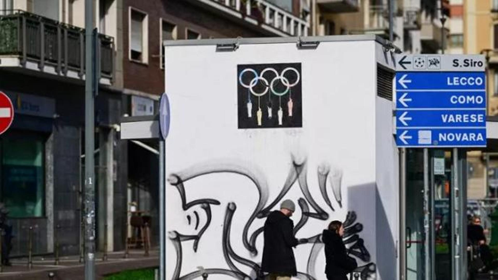Cinque persone impiccate ai cinque cerchi olimpici. Questo il contenuto dell’opera di street art dell’artista Rigaff, Riccardo Gaffuri, realizzata tra piazzale Loreto e via Costa, poco lontano dal luogo in cui fu impiccato Mussolini il 28 aprile 1945. Titolo dell’opera realizzata: Olimpiccato, fa parte della serie Political Pop.