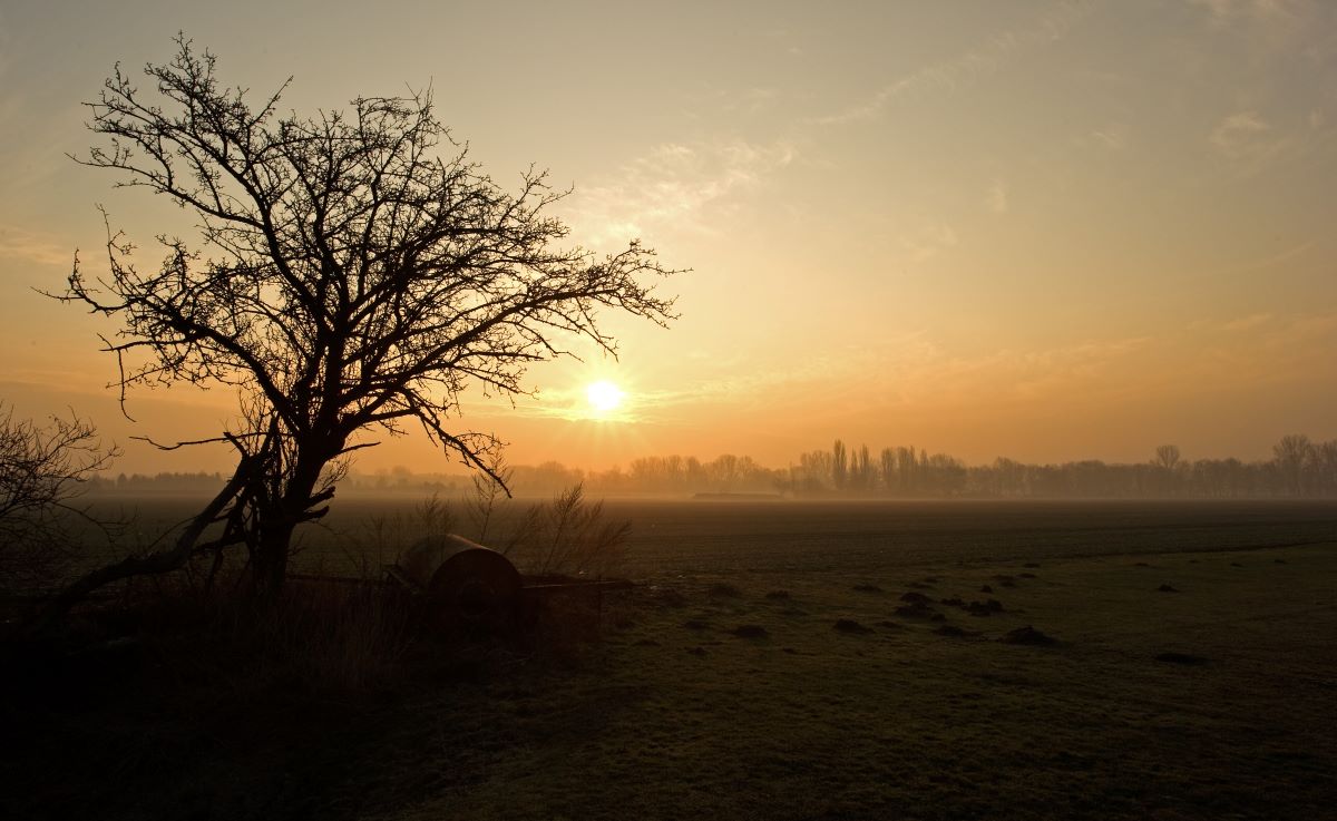 A tree pictured against the sunrise near Königs Wusterhausen. Photo: picture alliance / dpa | Arno Burgi