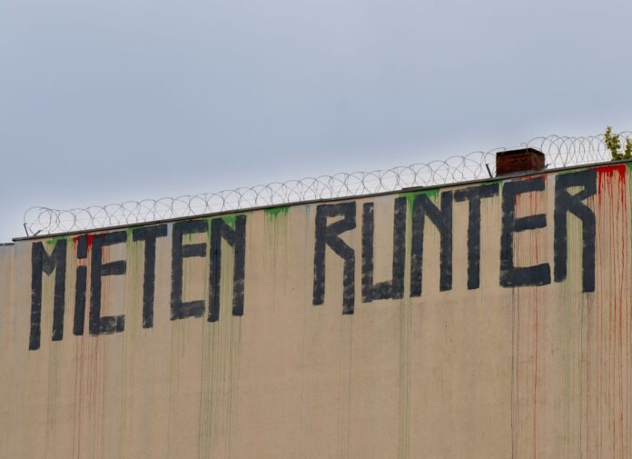 The words ‘Rents down’ are graffitied on the wall of a rental building. Photo: picture alliance/dpa | Monika Skolimowska