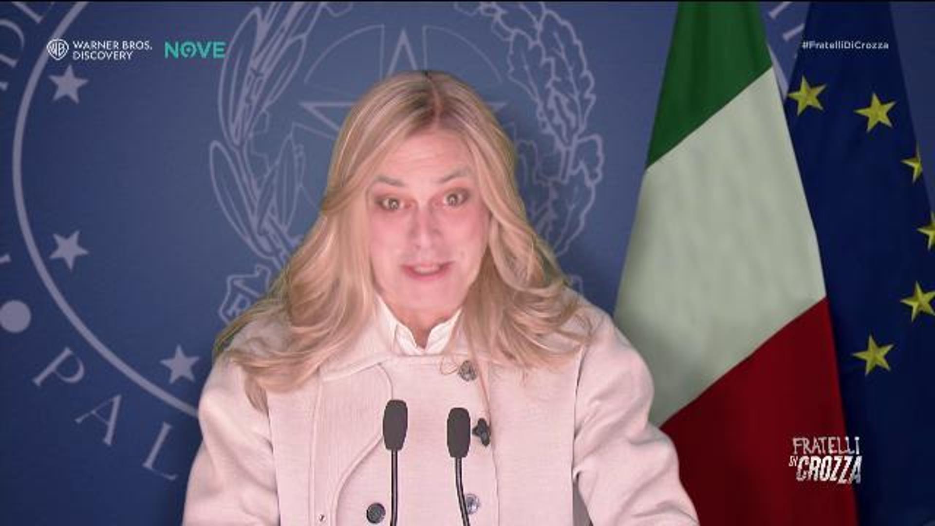 Nella nuova puntata di “Fratelli di Crozza”, in onda il venerdì sera in prima serata sul Nove e in streaming su Discovery+, Maurizio Crozza veste i panni della premier Giorgia Meloni euforica per gli attacchi ricevuti dal presidente statunitense Donald Trump