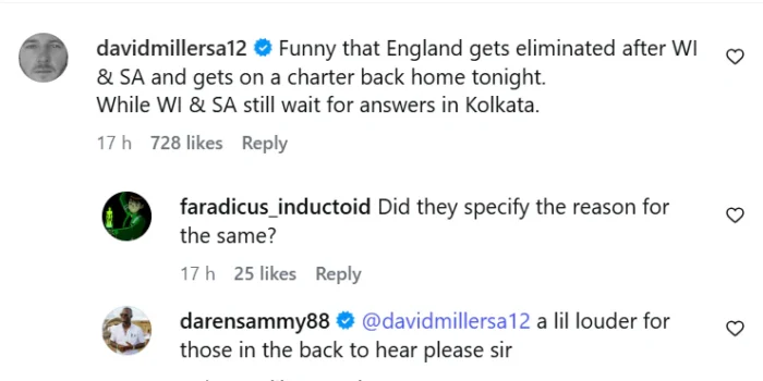 West Indies head coach Daren Sammy soon joined the discussion, backing Miller’s concerns in the comment section of the same post. Sammy responded humorously but pointedly, asking Miller to repeat the issue ‘a little louder for those in the back.’