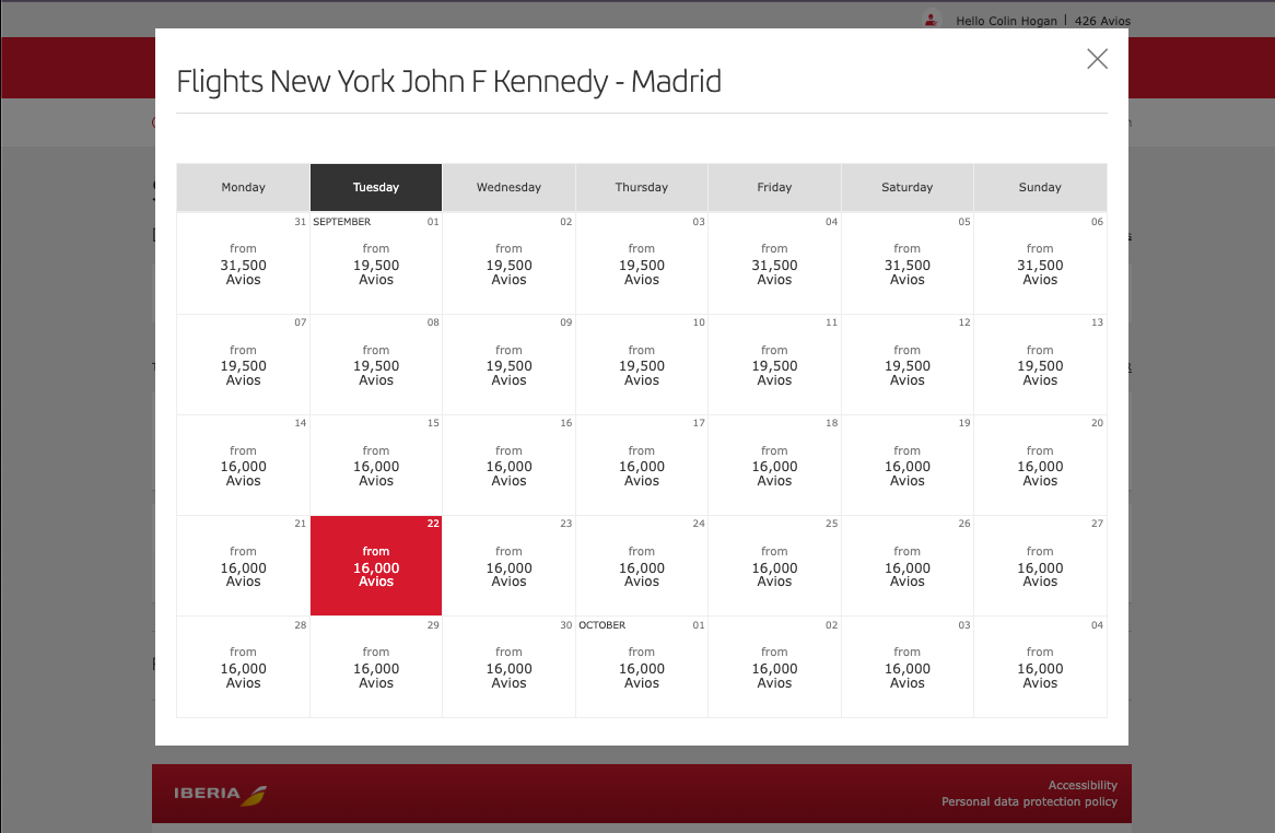 To search award pricing, log into your Iberia Club account and select “Pay with Avios” before you search. If your dates are flexible, you can select the “Monthly view of flights” option to get a full five-week calendar view of prices. You can also filter the results by fare class.