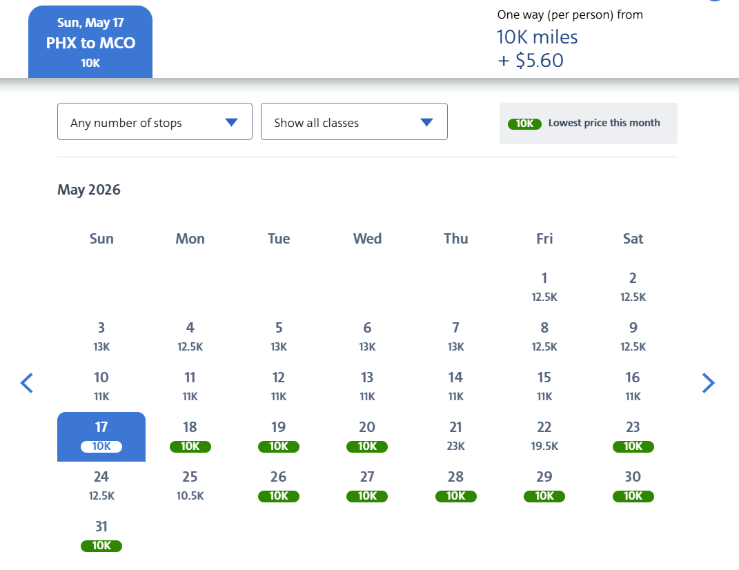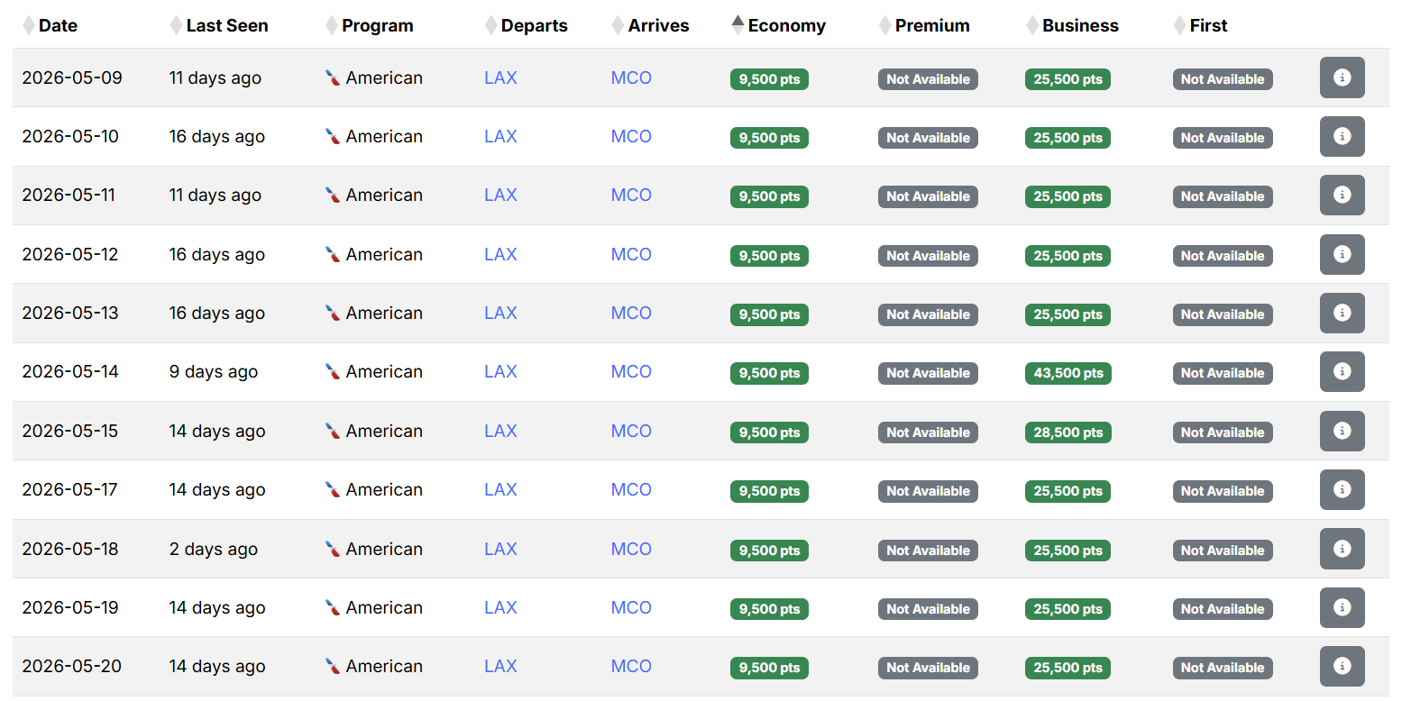 We found great rates on nonstop American Airlines flights from two West Coast destinations. You can fly from Los Angeles International Airport (LAX) to MCO for 9,500 AAdvantage miles one-way or from Phoenix Sky Harbor International Airport (PHX) to MCO for 10,000 miles one-way. For either option, expect to pay $5.60 in taxes and fees. Both routes have good availability in the second half of May and throughout June.