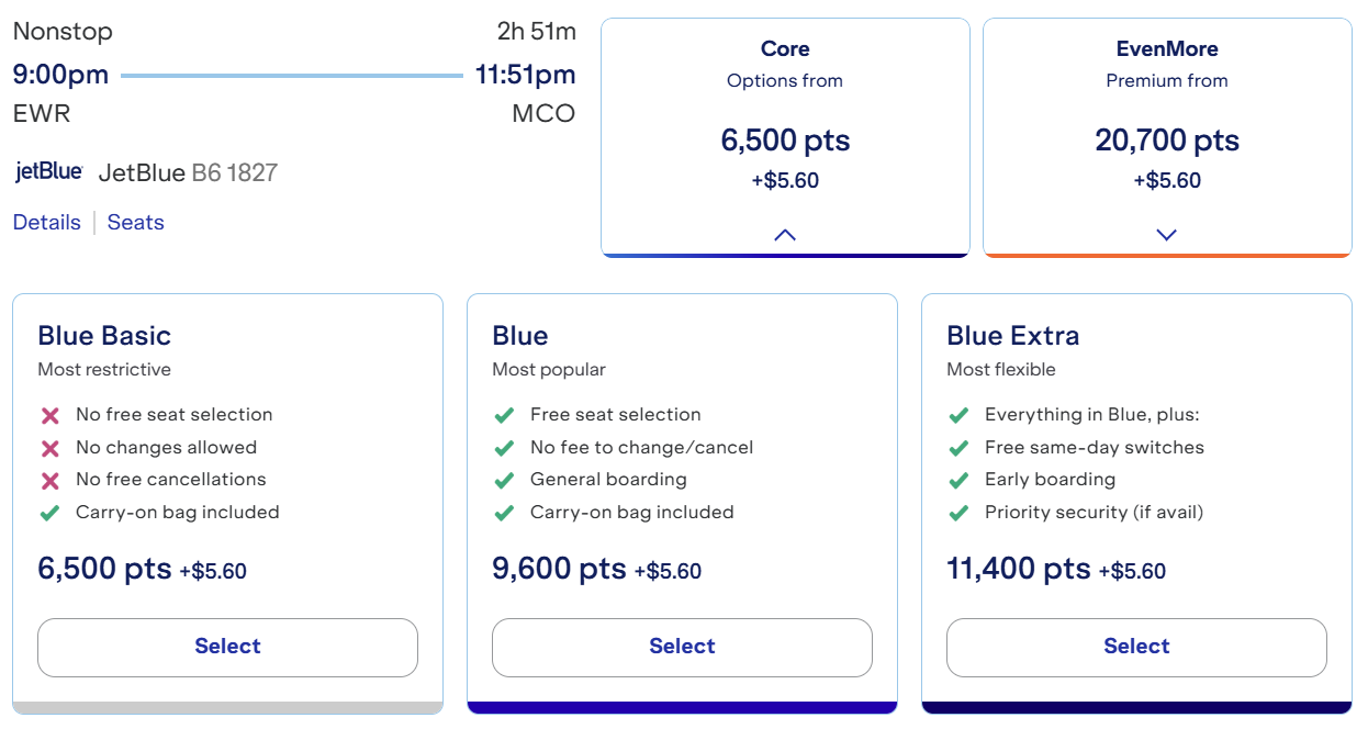 If you’re based on the East Coast, JetBlue TrueBlue has similar prices from both John F. Kennedy International Airport (JFK) in New York and Newark Liberty International Airport (EWR). We’ve seen rates ranging from 9,200 to 9,900 TrueBlue points each way for standard economy fares or just 6,500 points for basic economy, plus minimal taxes and fees.