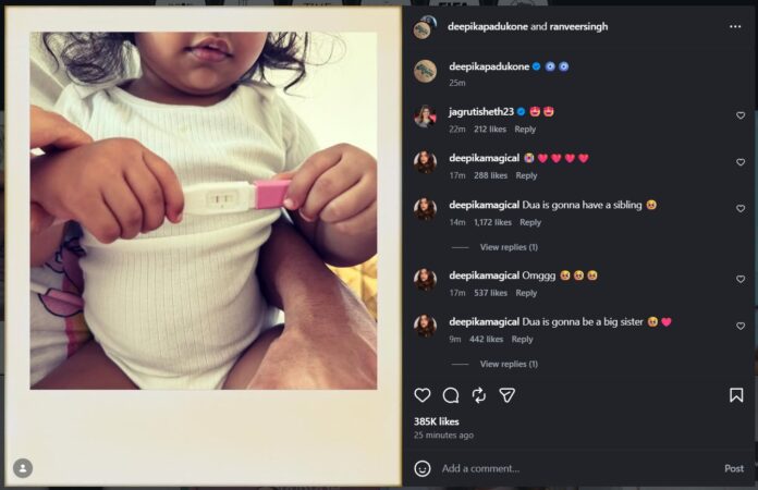 New Delhi: Actors Ranveer Singh and Deepika Padukone on Sunday announced they are expecting their second child. The couple shared a collaborative post on their respective Instagram handles, which featured their first daughter, Dua, holding a positive pregnancy test kit.