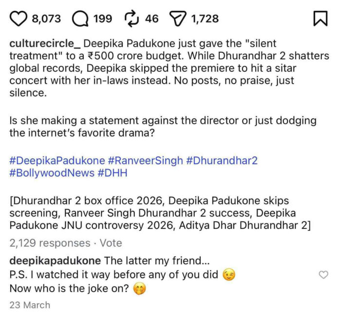 The chatter peaked when a viral reel wondered aloud whether her silence was a statement in itself or simply the internet reading too much into it. Deepika’s response? Effortless, cheeky, and cutting through the noise in a single stroke. “The latter my friend… P.S. I watched it way before any of you did. Now who is the joke on?” she commented.