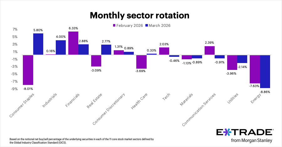E*TRADE from Morgan Stanley’s monthly analysis finds the three most-bought sectors in March were consumer staples (+5.80%), industrials (+4%), and financials (+2.88%)—the first two being among the weakest performers last month. The sectors with the highest net-selling were energy (-8.86%), utilities (-2.14%), and communication services (-0.91%). The data reflects net buy/sell activity in S&P 500 sectors on the platform.