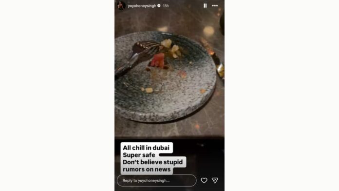 Sharing a video from a restaurant in Dubai, Honey Singh wrote, “All chill in Dubai. Super safe. Don’t believe stupid rumours in the news.”
