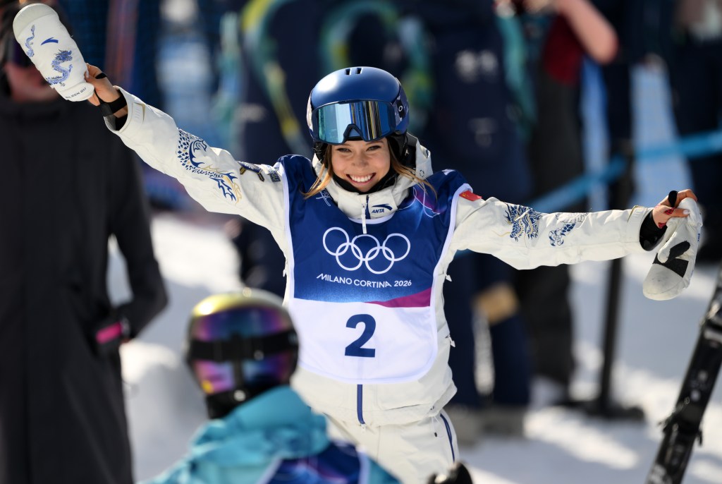 Eileen Gu celebrates after winning the Women’s Freeski Halfpipe Final at the Milano Cortina 2026 Winter Olympic Games on Feb. 22, 2026. Getty Images