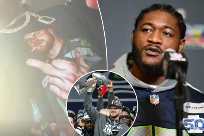 During an appearance Wednesday on “Up & Adams,” Seattle linebacker Ernest Jones IV proudly unveiled his Super Bowl 2026 parade shirt, which featured a depiction of quarterback Sam Darnold giving a one-finger salute while holding a beer and smoking a cigarette.