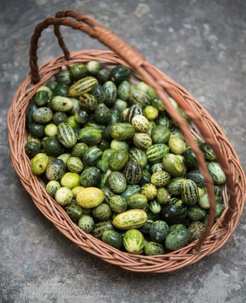 Unlike its bitter cousin, tumba, kachri offers a pleasant surprise when you bite into it. When ripe, it has a unique sweet-and-sour taste with hints of melon and cucumber. At first glance, kachri looks like a miniature watermelon, with its round shape and occasionally striped or mottled skin.