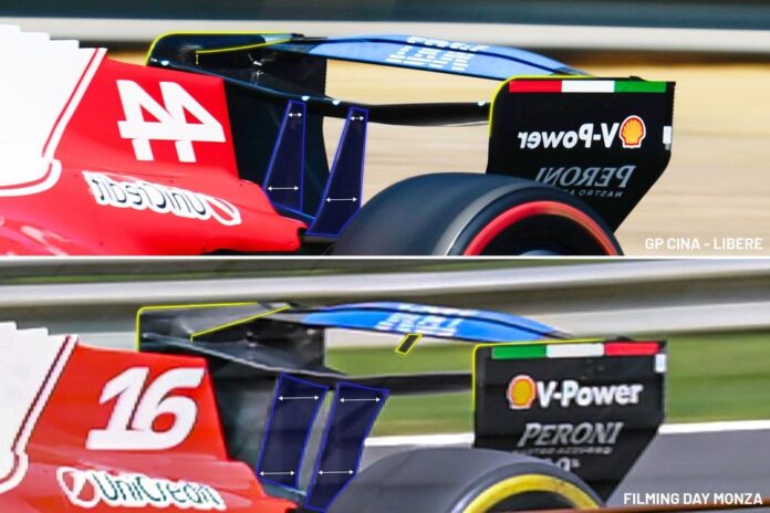 That’s why Ferrari tested its updated wing in Monza, with the endplate area, which houses the actuator, also largely redesigned. The endplates’ geometry is now more angular and less rounded at the top near the Italian flag.