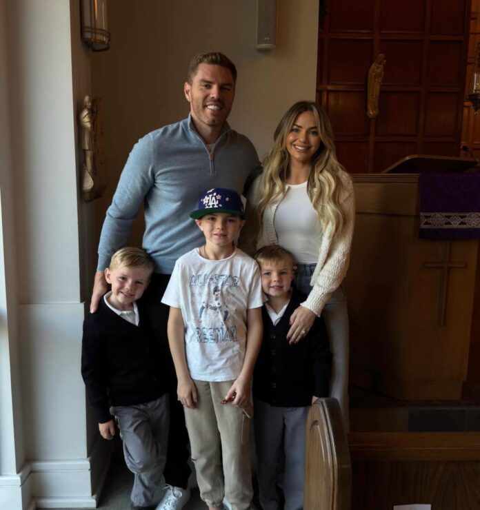The footage showed the Freemans’ three boys — Charlie, 9, Max, 5, and Brandon, 5 — guessing what the sex of their future sibling will be — before they each smacked baseballs off a tee that were filled with pink smoke.