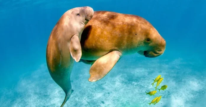 The dugong (Dugong dugon), often called the sea cow, is a large, slow-moving marine mammal that feeds exclusively on seagrass.
