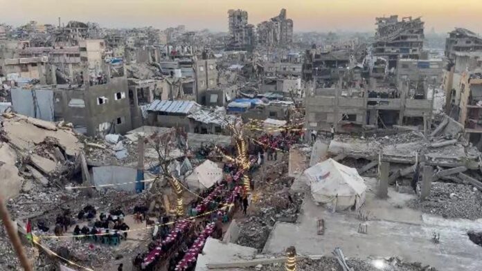 In tutta la Striscia di Gaza i rifugiati hanno festeggiato il primo Iftar del mese del Ramadan allestendo tavoli tra le macerie o le tende nei campi profughi. La rottura del digiuno al tramonto è un momento molto significativo per la popolazione palestinese che sta affrontando una delle più dure carestie della sua storia a causa del blocco degli aiuti imposto dall’esercito Israeliano nei mesi scorsi.
