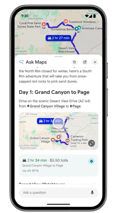 The tech giant says the feature can also be used to quickly plans trips. For example, you could ask: “I’m headed to the Grand Canyon, Horseshoe Bend, and Coral Dunes, any recommended stops along the way?” Maps will then give you directions, ETAs, and tips from real people, like how to find a hidden trail or get a free entry ticket.