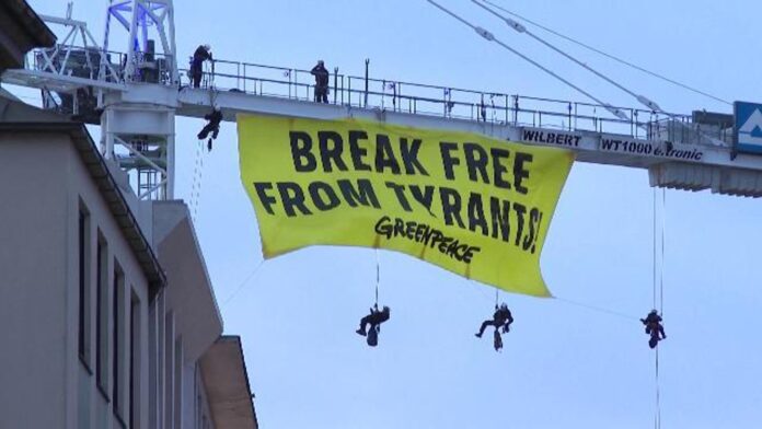 Protesta spettacolare a Monaco. Attiviste e attivisti di Greenpeace hanno appeso un grande striscione con la scritta “Break free from tyrants” a una gru vicino a Marienplatz, alla vigilia della 62ª Conferenza sulla sicurezza di Monaco. L’azione si è svolta poche ore prima dell’apertura ufficiale dell’evento con l’intervento del cancelliere tedesco Friedrich Merz. Sul posto sono intervenute le forze dell’ordine, mentre l’organizzazione ha annunciato altre iniziative. La conferenza si concluderà domenica 15 febbraio.