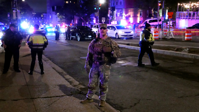 Police and National Guard stand in front of the Washington Hilton after the White House Correspondents Association Dinner was postponed April 25, 2026, in Washington, DC. (Chip Somodevilla/Getty Images)