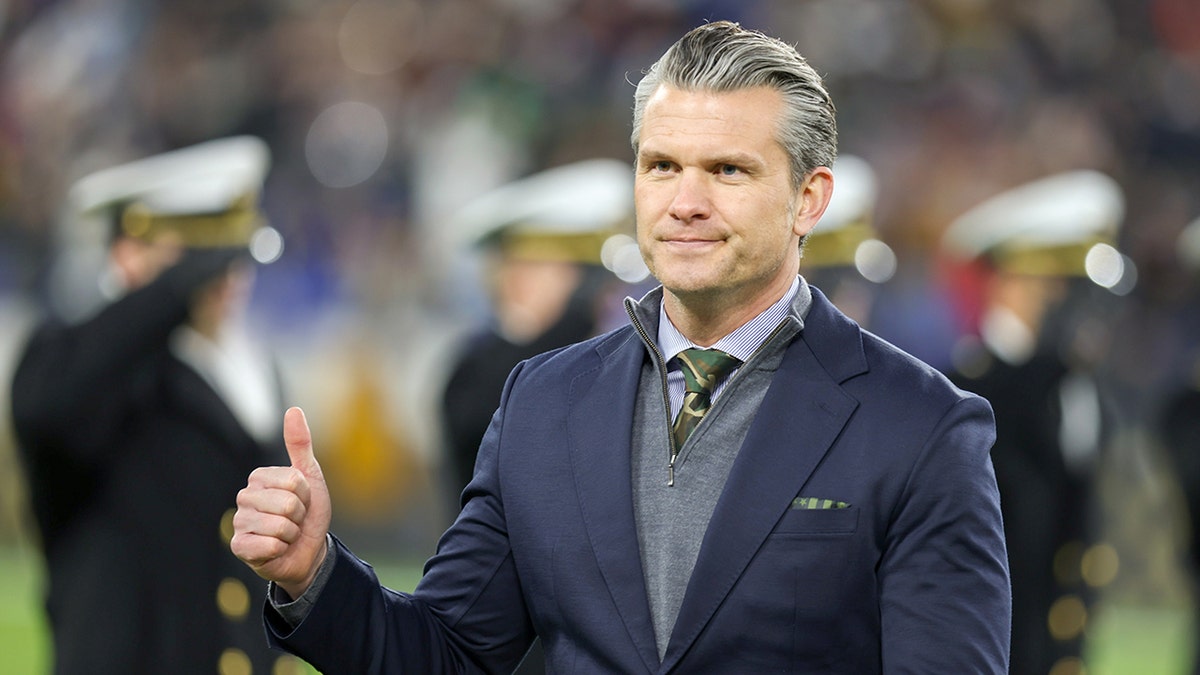 U.S. Secretary of War Pete Hegseth gives a thumbs up during a game between the Navy Midshipmen and Army West Point Black Knights at M&T Bank Stadium on Dec. 13, 2025 in Baltimore, Md. (Roger Wimmer/ISI Photos/ISI Photos via Getty Images)