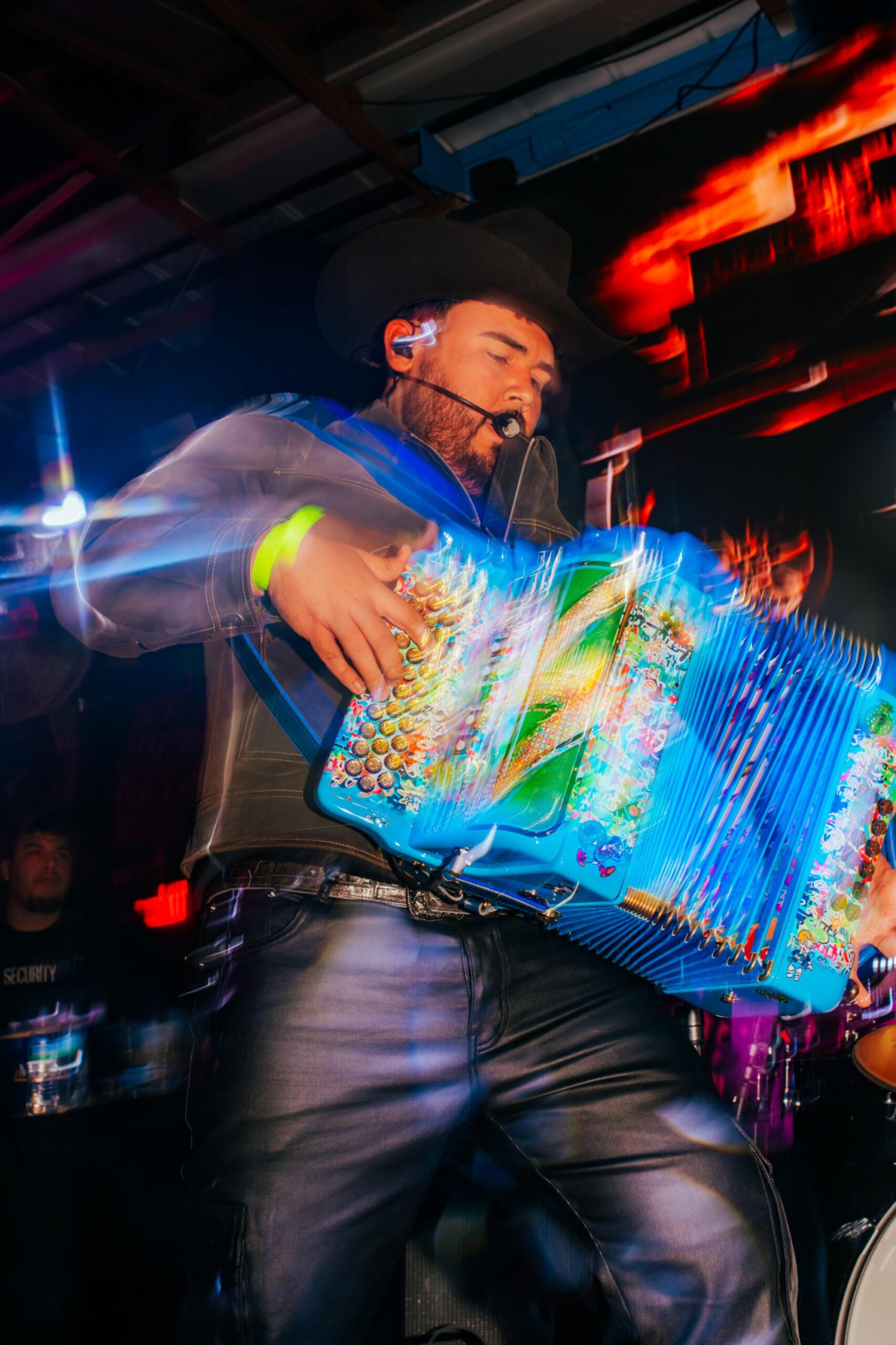 The dynamic singer delivered every lyric with his whole body as he frenetically tapped the buttons of his brightly colored accordion, doing his best to make the squeezebox sound like an electric guitar. The drum set and bajo quinto kept pace, making the set feel more like a rock show than a backyard kickback.