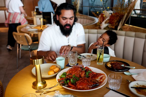 But then comes the live crab, a big Northern Territory muddie in a cascade of Malaysian chilli. You pull on plastic gloves, crack a claw and suck out the flesh, sweep up the belachan-scented sauce with mantou. You add a bowl of pipis, tossed in black pepper curry, and prise them from their shells.