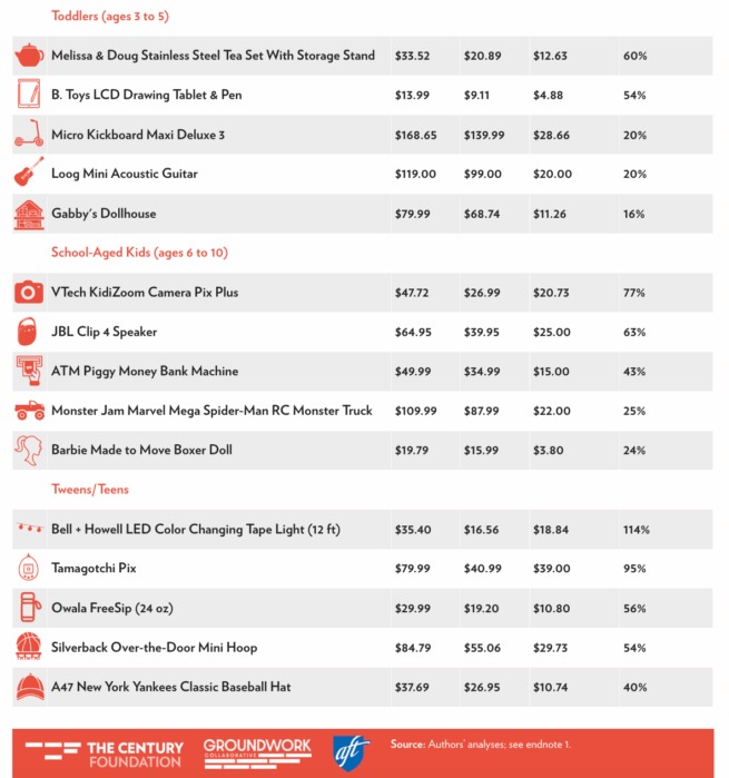 The list is “representative” of top-selling holiday gifts on Amazon, including items that cost as little as $10 and as much as $500, the study said.