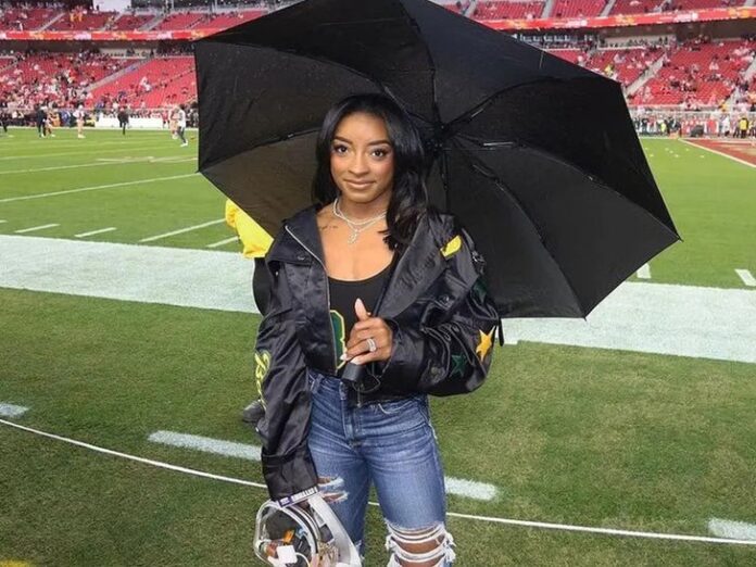 Simone Biles may be an Olympic champion, but on game days, she’s full-on WAG — umbrella and all!