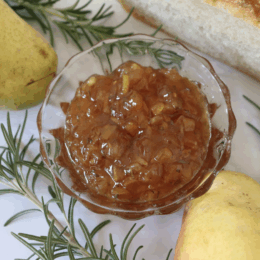 These amazing but simple Homemade Pear Preserves are made with honey, rosemary, and a hint of lemon. The sweet and savory mixture is perfect for hearty bread, cheese boards, or gifting during the holidays. Just know that your friends will be begging you for more!