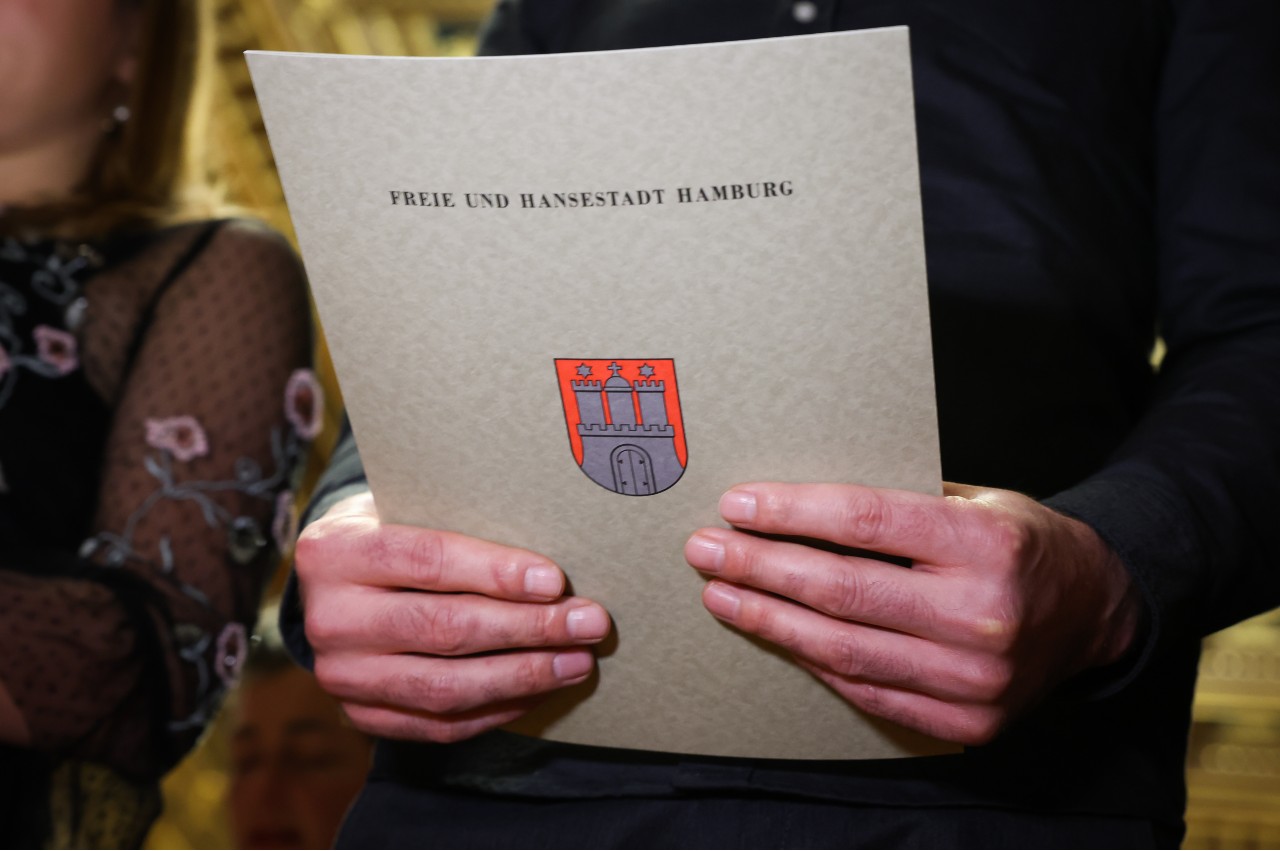 A newly naturalised German citizen holds their citizenship certification in Hamburg. Photo: picture alliance/dpa | Christian Charisius