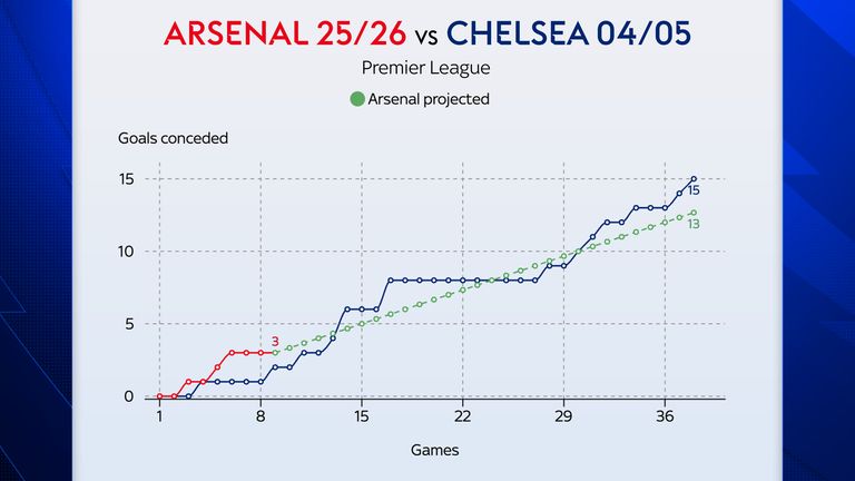 And if they keep going like this, they’re also on course to break Chelsea’s record for the fewest goals conceded in a Premier League season. Jose Mourinho’s Blues let in just 15 goals in the 2004/05 campaign – but Arsenal are on course to let in just 13.