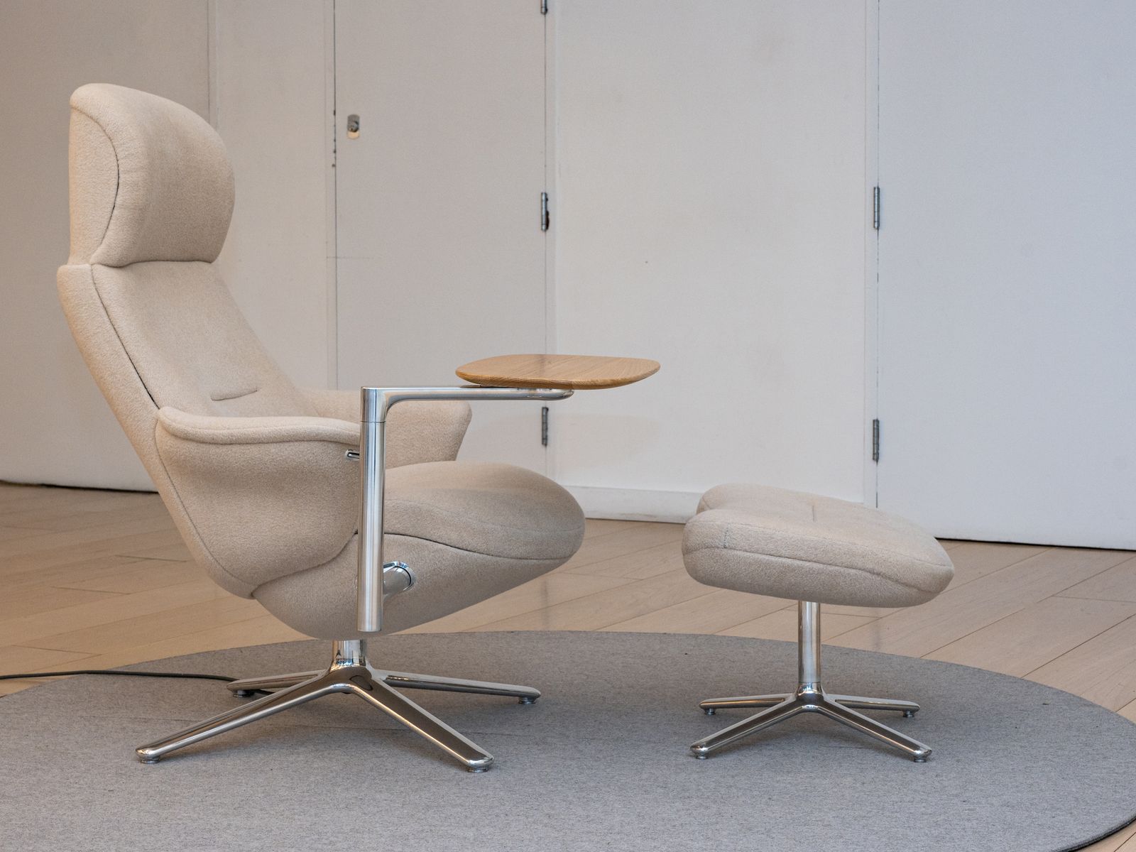 The chair starts at $8,995, but that doesn’t include the side table or ottoman. Add those and it costs $10,995. The model pictured above uses Alpaca wool fabric and brings the cost up to $14,995. (There are more than 300 fabrics and colors to choose from, and the swiveling table comes in various woodgrains.) The Herman Miller Eames, of which the Diffrient Lounge also takes inspiration, costs roughly $8,500 today, depending on which leather you choose.