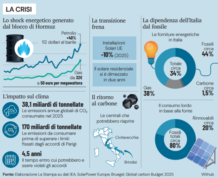 Il quadro italiano appare particolarmente critico per via di una dipendenza strutturale dai fossili che la crisi mediorientale ha riportato prepotentemente al centro del dibattito nazionale. Nonostante i progressi della generazione rinnovabile, il mix elettrico italiano vede ancora i combustibili fossili coprire tra il 40% e il 48% della produzione, con il gas naturale che rimane la fonte principale garantendo circa il 40% dell’elettricità nazionale. Se si allarga lo sguardo al mix energetico totale, che include trasporti e riscaldamento, la quota dei fossili sale all’80%, esponendo il Paese a ogni variazione dei flussi attraverso Hormuz.